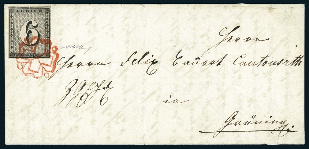 Zürich 6, senkrechter Unterdruck, Type IV, 49. Marke des Bogens, in sehr frischen Farben mit deutlichen Unterdrucklinien, allseits breit geschnitten mit sichtbaren Trennungslinien oben und rechts, sehr sauber entwertet mit klar und dekorativ ausgeprägter, roter Zürcher-Rosette, auf vollständigem Faltbrief, innseitig datiert Mariafeld 10. Dezember 1843, nach Grüningen adressiert. Der Brief weist als grosse Ausnahme kein Datum oder sonstige Aufgabestempel auf. In aussergewöhnlicher Erhaltung. Atteste Herstch, Hunziker und Nussbaum, signiert A. Bolaffi. SBK 2S = CHF 6.000.