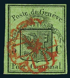 Grosser Adler gelbgrün, sehr gut erhaltenes Exemplar, 16. Marke des Bogens, besonders frische Papierfarbe, voll-breitrandig geschnitten mit links kurzer Spur der Randlinie der Nebenmarke, sauber und zentrisch gestempelt mit roter Genfer Rosette (AW 2). Atteste Kimmel und Nussbaum. SBK 6 = CHF 2.600.