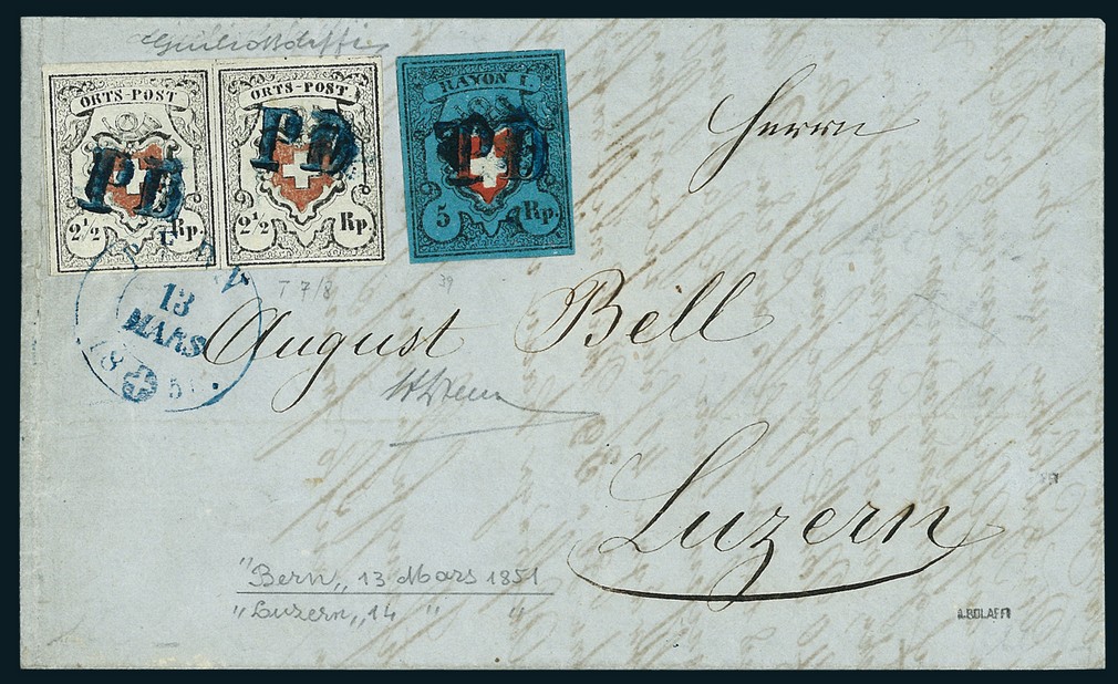 Orts-Post mit Kreuzeinfassung, Paar mit Typen 7 und 8, zusammen mit Rayon I dunkelblau ohne Kreuzeinfassung, Type 39, jede Marke mit sauberem blauen "PD" (AW 345) auf komplettem Faltbrief nach Luzern, Aufgabestempel "Bern / 13 Mars / 1851" auf das Paar und auf den Brief übergehend. Die Marken sind farbfrisch und weiss- bis überrandig geschnitten. Eine seltene Frankaturkombination, sowie ein wunderschönes Ausstellungsstück mit einer kontrastreichen Farbenkombination. Attest Marchand, signiert Hunziker, Moser, A. Diena und G. Bolaffi. SBK 13I, 15II. Provenienz: Burrus.