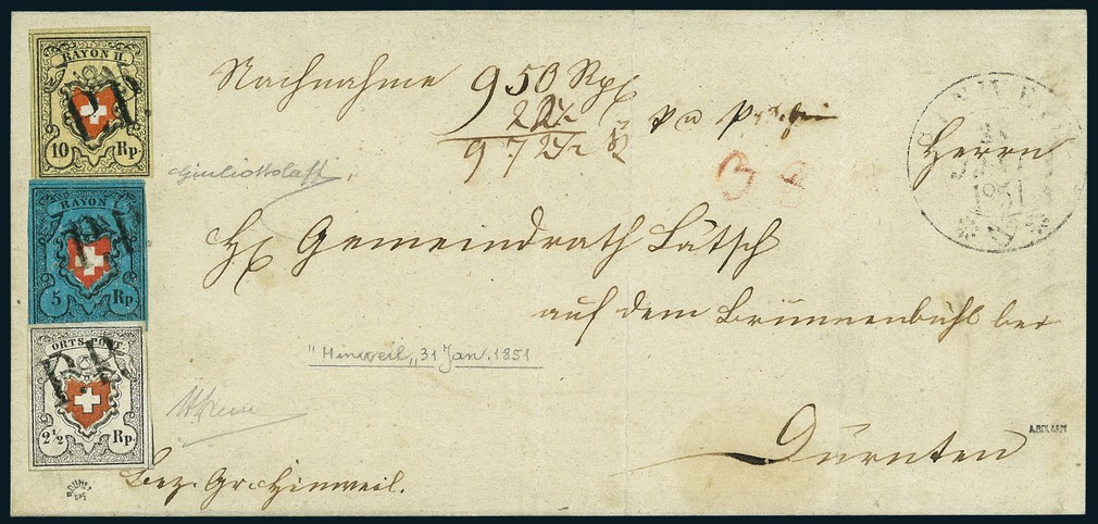 Orts-Post mit Kreuzeinfassung, Type 4, zusammen mit Rayon I dunkelblau ohne Kreuzeinfassung, Type 2, und Rayon II gelb ohne Kreuzeinfassung, Stein A2 l/u, Type 3, jeder Wert sehr sauber und klar entwertet mit schwarzen "P.P." aus dem VIII. Postkreis, leicht übergehend auf Nachnahme-Faltbrief über Fr. 9,72 1/2 nach Dürnten, rechts Aufgabestempel "Hinweil / 31 Janv 1851". Es fehlt vermutlich eine 5 Rp. Marke, um den Tarif von 22 1/2 Rp. zu decken. Alle Marken sind besonders frisch und gut bis meist überrandig geschnitten. Eine sehr attraktive Dreifarben-Frankatur. Attest Marchand, signiert A. Diena und G. Bolaffi. SBK 13I, 15 II, 16II.