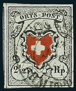 Orts-Post ohne Kreuzeinfassung, Type 35, sehr intensive Farbe, besonders frisch mit gutem Schnitt und Rahmen der Nebenmarke links, zart entwertet mit Doppelkreisstempel "St. Gallen / Vormittag". Attest Marchand, signiert Fulpius, A. Diena und G. Bolaffi. SBK 13II = CHF 3.800.