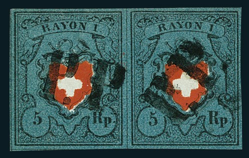 Typen 1 und 2 im Paar, regelmässig breit geschnitten an allen Seiten, jede Marke mit schwarzem "P.P." aus dem IX. Postkreis. SBK 15II = CHF 1.900.