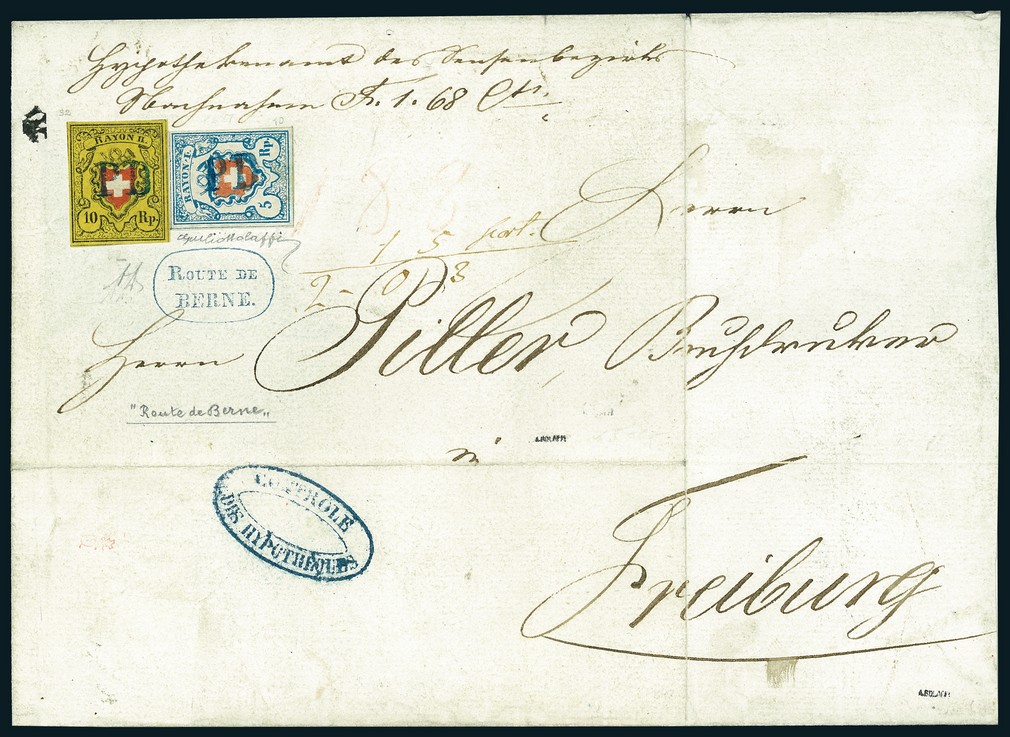 Druckstein B RU, Type 32, zusammen mit Rayon I hellblau ohne Kreuzeinfassung, Type 10, zwei sehr frische und sehr gut gerandete Marke, jede ideal entwertet mit blauem "PD" aus dem III. Postkreis, auf grossem Teil Nachname-Brief (zweimal gefaltet) nach Freiburg. Neben den Marken perfekt aufgesetzt blauer abgerundeter Kastenstempel "ROUTE DE BERNE." (AW 28/4). Ein sehr dekoratives Stück. Attest Marchand, signiert Moser. SBK 16II, 17II.