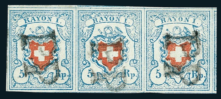 Druckstein C2 RU, Typen 29-30-31, sehr frischer Dreierstreifen, aussergewönlich breit gerandet mit Teilen der Nebenmarken oben und rechts, jeder Wert leicht gestempelt mit "PP" aus dem VII. Postkreis. Attest Marchand. SBK 17II = CHF 1.150.