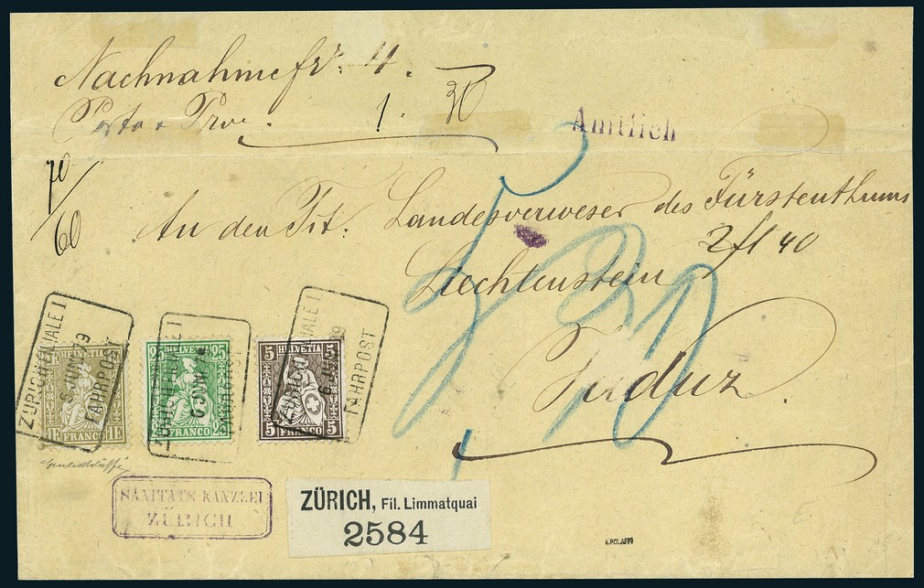 5 Rp. braun, 25 Rp. grün und 1 Fr. golden (leichter Zahnfehler unten), jede Marke sehr sauber entwertet mit Rahmenstempel "Zurich Filiale I / 6 Juni 79 / Fahrpost" auf Nachnahme nach Vaduz. Umschlag gefaltet und leicht gekürzt oben mit fehlender Klappe. Ungewöhnliche und dekorative Dreifarben-Frankatur. Attest Marchand. SBK 30, 34, 36.