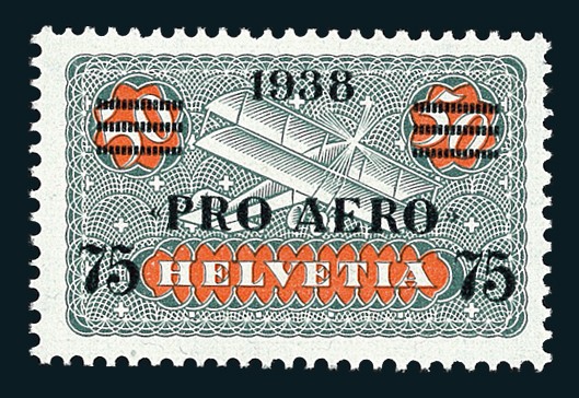 1938, 75/50 Rp. Flugpost schwarz und rot, "PRO AERO" Aufdruck, gut zentriert, postfrisch mit Originalgummi. Ein prächtiges Exemplar dieser sehr seltenen Marke. Attest Marchand, signiert Hassel und G. Bolaffi. SBK F26 = CHF 22.500.