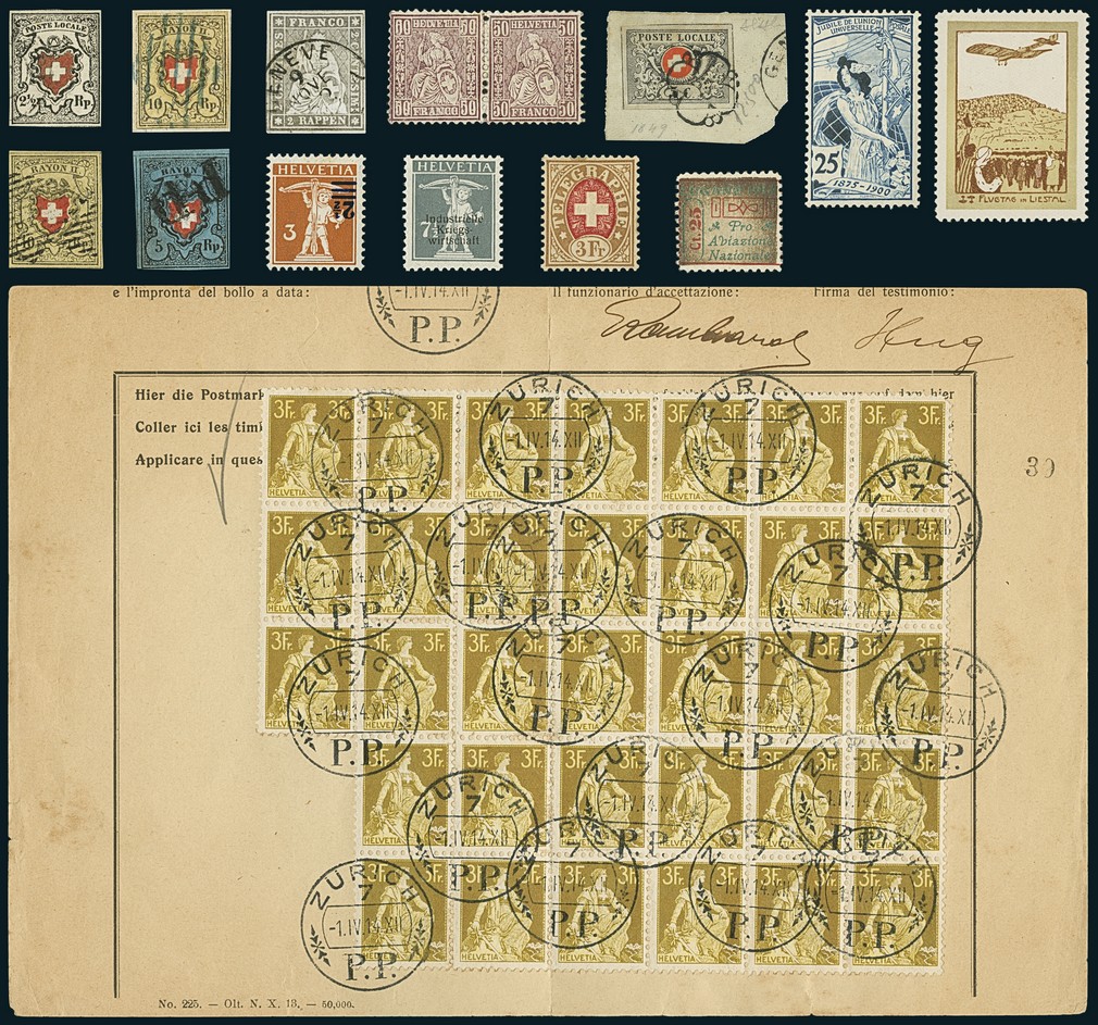 Switzerland / Schweiz.1850-2000: Interessante und vielseitige Sammlung in 10 Alben, gestempelt und ungestempelt, beginnend mit "Vaud 5", wenig Altschweiz aber einem Paar besseren Werten, Strubel, Sitzende Helvetia (auch Abarten mit Doppelprägungen), Stehende Helvetia (mit Plattenfehler "Helvetta" und Farbproben), Ziffer, UPU postfrisch, ab 1907 mit besseren Marken postfrisch, sowie Abarten mit 1921 2 1/2 auf 3 Rp. mit kopfstehendem Aufdruck (Attest Rellstab); Pro-Juventute beginnend mit Vorläufer (mit Gummi); Flugpost mit 10 Vorläufer mit Atteste für die bessere Werte. Auch Gedenkblocks ab Naba 1934, Porto- und Telegraphenmarken, Francozettel; Dienstmarken ab 1918 mit Kriegswirtschaft im kompletten postfrischen Satz (dünner Schrift), Arbeitsamt dabei mit 1924-28 1,20 Plattenfehler "HFLVETIA" gestempelt (Attest Nussbaum), etc. Dazu zahlreiche Briefe beginnend mit Rayon II auf Nachnahme mit "PP" im Kreis (Attest Rellstab), spätere Ausgaben auf Brief bis 1940 mit besseren Frankaturen, Auslandsbriefe, Flugpostbriefe mit besseren Frankaturen, etc. Mehrere Atteste und Dubletten sind vorhanden. Eine Begutachtung dieses vielseitigen Loses wird empfohlen.