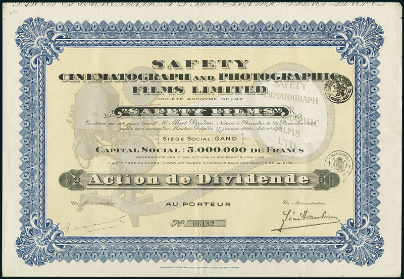 Safety Cinematograph and Photographic Films. Dividendenaktie ohne Nennwert. Gand, 17. Januar 1929. Nr. 6'182 Nr. 06182. Decorative film share with projector in the underprint. VF.