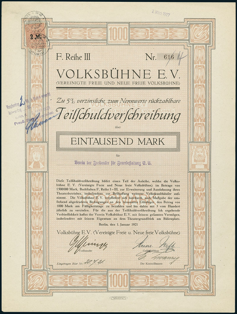Volksbühne Berlin. Lot 2 verschiedene Stücke: a) Neue Freie Volksbühne, Teilschulverschreibung, 100 Mark, Berlin, 1. Oktober 1918. b) Volksbühne E.V. (Vereinigte Freie und Neue Freie Volksbühne), Teilschuldverschreibung, 1'000 Mark, Berlin, 1. Januar 1921. Nr. 1440 / 616. Zusätzlich beigelegt ist eine Mitgliedskarte von 1917. Die Freie Volksbühne Berlin wurde 1890 als Verein gegründet, der nach dem Motto "Die Kunst dem Volke!“ das Ziel verfolgte, gesellschaftlich und sozial schwächer gestellten Bevölkerungsgruppen den Zugang zu Bildung und zum kulturellen Leben zu ermöglichen. Die Mitglieder nahmen an einer Verlosung von Theaterkarten zu einem ermässigten Preis teil. In Aufführungen nur für die Mitglieder wurden neben beliebten Klassikern auch aktuelle und kritische Bühnenstücke gezeigt. Nach Vereinsinternem Streit spaltete sich 1892 die Neue Freie Volksbühne ab. 1914 errichtete diese am Bülowplatz ein modernes Theater für 2000 Zuschauer. Dazu wurde eine Anleihe (Los a) im Betrag von 600'000 Mark aufgelegt. Der erste Direktor und Intendant der Freien Volksbühne wurde der berühmte Max Reinhardt (1873-1943). 1919 schlossen sich die beiden Vereine wieder zusammen. 1921 wurde eine weitere Anleihe (Los b) zur Erweiterung und Ausdehnung des Theaterbetriebes aufgelegt. 1933 war es vorbei mit der künstlerischen Kreativität. Die Volksbühne wurde im Reichsverband Deutsche Bühne dem Propaganda-Apparat von Joseph Goebbels unterstellt. EF.