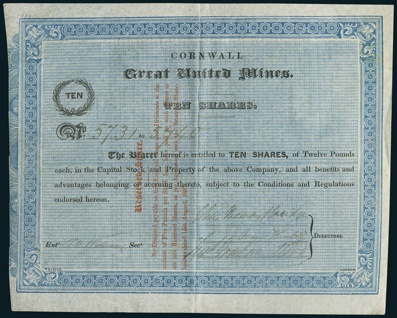 Cornwall Great United Mines. Certificate 10 Shares at £12 each. London approx. 1837. Nr. 5731-40. The company operated several small mines in Cornwall. Rare. EF.