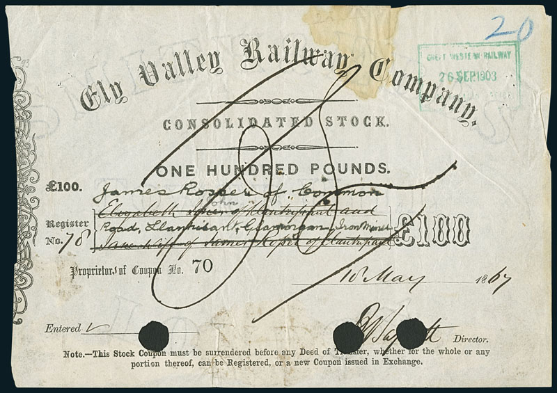 Ely Valley Railway. Consolidated Stock £100. 10. Mai 1867. Nr. 70. The Ely Valley Railway was a mineral line authorised on 13 July 1857 to serve the collieries of the Ely Valley in South Wales. The first section of the line, between Llantrisant and Tonyrefail, opened on 2 August 1860. It was originally operated as part of the Great Western Railway system and later absorbed by the same company. Three cancellation holes and stain. VF.