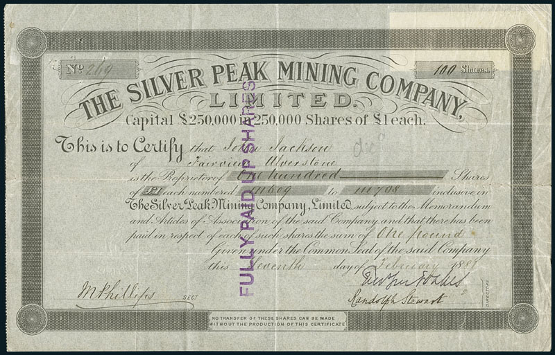 Silver Peak Mining Company Ltd. Certificate of 100 Shares at £1 each. 7. February 1881. Nr. 269. The company owned silver mines in Colorado. Enclosed a detailed plan of the mine and lodes and a memorandum on business activity. Attached to share, card of H. Vigne & Sons. 2. Tokenhouse Buildings, Lothbury, London, Stock&Share Brokers. Interesting and rare item. VF.
