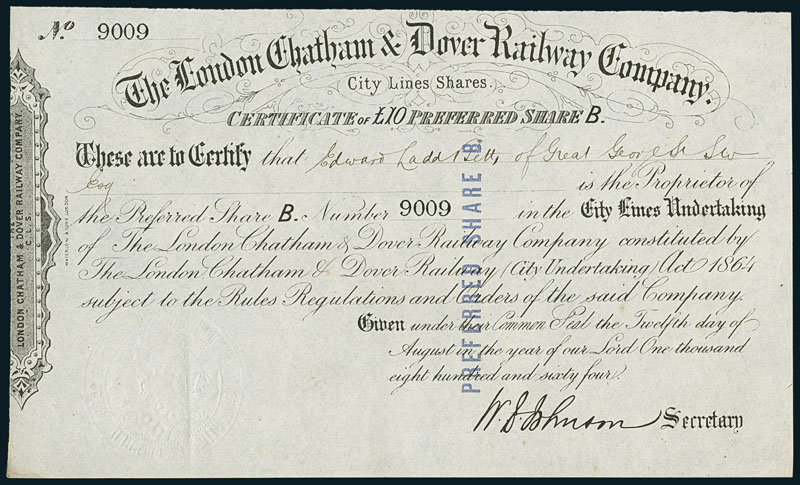 The London Chatham & Dover Railway Co. Preferred Share B, £10. 12. August 1864. Nr. 9009. The company was founded as East Kent Railway in 1859. The name changed in the same year. It operated many railway lines in east and north Kent. It formed together with three other lines the Southern Railway in 1923. VF.