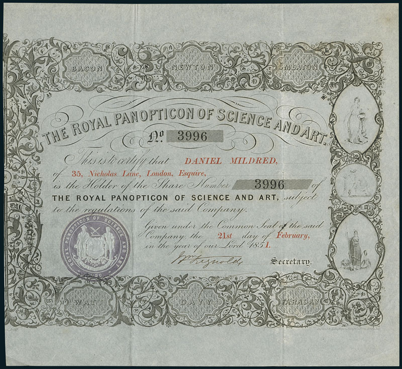 The Royal Panopticon of Science and Art. 1 Share, 21. February 1851. Nr. 3996. The Royal Panopticon of Science and Art was one of the grand social institutions and architectural splendours of Victorian London. It was built on the Eastern side of Leicester Square, opening on 18 March 1854. The Royal Panopticon was an imposing iconic building flanked by minarets. The facade had tiles made by Minton and shields and coats of arms of the most prominent scientists, writers and artists, including Oliver Goldsmith, Sir Humphry Davy and of course Queen Victoria. It boasted that it had the largest organ in the world when it opened. It was a showcase venue for the very best achievements in Science and Arts of the time and attracted 1'000 visitors per day. Two years later however, it closed, obtained a license for theatrical performances and was re-opened as the Alhambra Theatre. The organ was sold to St Pauls Cathedral. The site is now occupied by the Odeon Leicester Square. Very decorative share, inscribed the names of famous scientist: Francis Bacon (1561-1626), Isacc Newton (1642-1727), John Smeaton (1724-1792), James Watt (1736-1819), Sir Humphry Davy (1778-1829), Michael Faraday (1791-1867). (www.vanishedlondon.com/the-royal-panopticon-of-science-art/). VF.