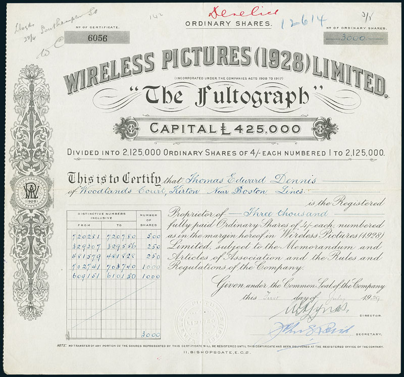 Wireless Pictures (1928) Limited 'The Fultograph'. Certificate 3'000 Shares. 1. July 1929. Nr. 6056. The world's first fax machine: The fultograph was an early, clockwork image-receiving device. It took signals from the loudspeaker socket of a radio receiver and used an electrochemical process to darken areas of sensitised paper wrapped on a rotating drum. Produced by the american inventor Dr. Otho Fulton (1868-1938), the system was used briefly in the late 1920s to broadcast images to homes by radio. A 9 x 12 cm picture was transmitted in four minutes. The machines themselves were expensive (£22 15s 0d in 1928) and required a good receiver to operate. (wikipedia). VF.