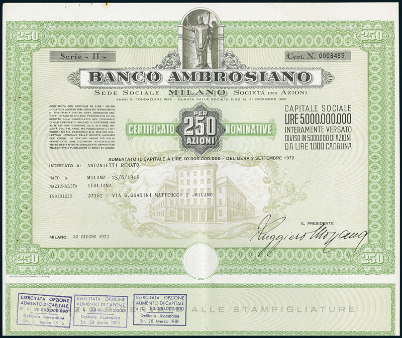 Banca Ambrosiano. Certificate of 250 shares 1000 Lira each. Milano, 20 Guigno 1973. Nr. 0003485. Four small rust spot at the top. The infamous Banco Ambrosiano was founded in Milan in 1896 and was named after Saint Ambrose, the fourth century archbishop of the city. The bank was the source of many scandals and finally collapsed in 1982. At the centre of the bank's failure was its chairman, Roberto Calvi and his membership in Licio Gelli’s Lodge Propaganda Due (P2). Vatican Bank was Banco Ambrosiano's main shareholder. The death of Pope John Paul I in 1978 is rumoured to be linked to the Ambrosiano scandal. This would later give Hollywood one of the subplots for the film The Godfather Part III. In 1982, it was discovered that the bank was unable to account for $1.3 Billion of its assets. Calvi fled the country on a false passport and was soon afterwards found hanging from Blackfriars Bridge in London. EF.