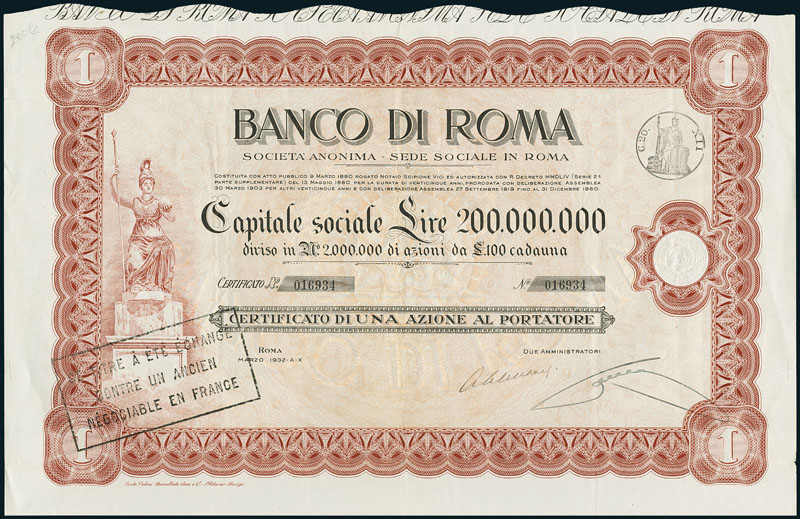 Banco di Roma. Una azione, Roma, Marzo 1932. Nr. 016934. EF.