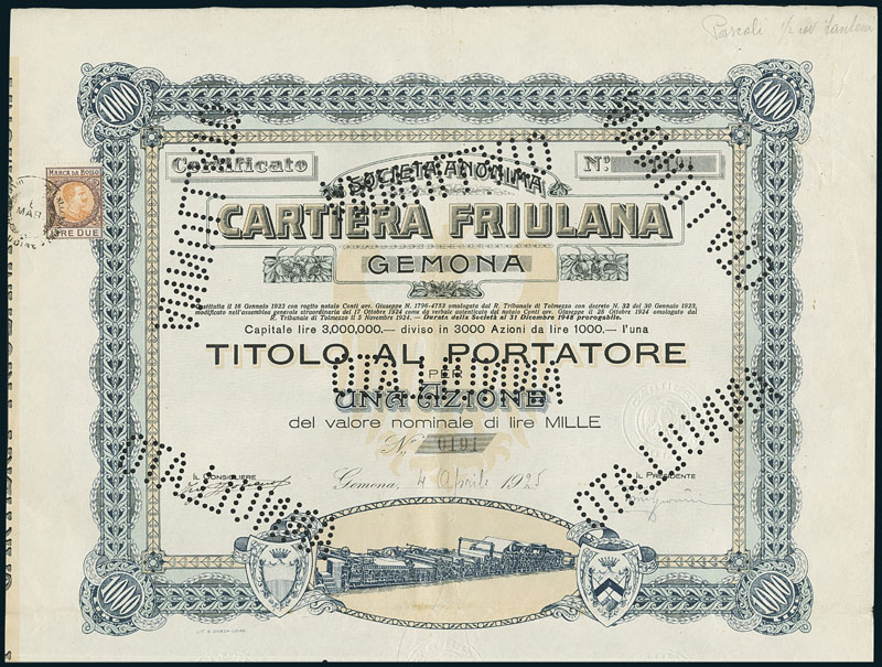 Cartiera Friulana. Una Azione L 1000. Gemona, 4 Aprile 1925. Nr. 0191. Very decorative share of this paper mill. Cancellation holes. EF.