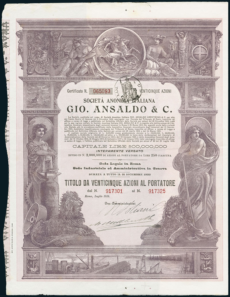 Gio. Ansaldo. Certificato 25 Azioni. Roma, Luglio 1918. Nr. 917301-325. Renowned players in the Genoese business world founded the company in 1853. It focused on manufacturing and repairing railway components. The company prospered and soon employed 10'000 workers in seven factories. It was starting to expand into sectors such as shipbuilding and mechanical works in general. In 1904, Ansaldo was bought by Ferdinando Maria Perrone. He focused on ironworks and weapons production. In 1921 the company ran into major financial problems and entered the control of the Istituto per la Ricostruzione Industriale (IRI). The 25 shares certificate is rare. VF.