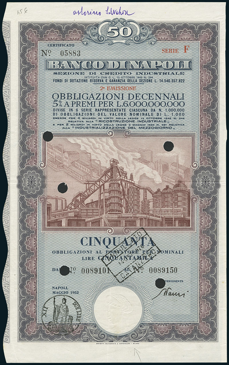Italian Selection. 4 items: a) Banco di Napoli, 50 Obbligazioni, Napoli 1952. b) SA Petroli d'Italia, 1 Azione L 100, 1940. c) Cassa di Risparmio della Tripolitania, Obbligazione L 500 Serie XIV, Tripoli 1930. d) idem, L 100, Serie XIX.