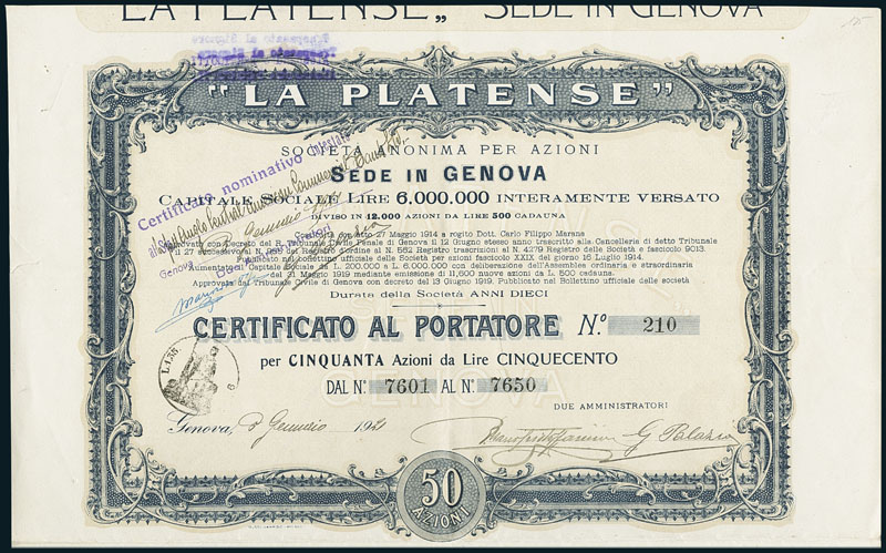 La Platense. 50 Azioni da Lire 500. Genova, 5 Gennario 1902. Nr. 210 / 7601-50. The company served the route from Genoa to Brazil (to the mouth of the Rio de la Plata, hence the name). Stamp certifying the conversion of the title into a nominative share and the transfer of ownership to Anglo Central Commercial Bank Ltd. VF