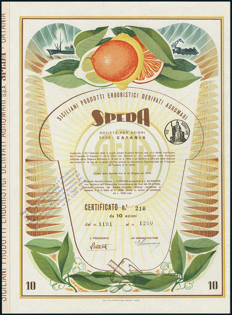 Speda - Siciliani Produtti Erboristici Derivati Agrumari. Certificato da 10 à L 10000 Azioni, Catania, 2.5.1956. Decorative share of this specialist for citrus fruits. VF.