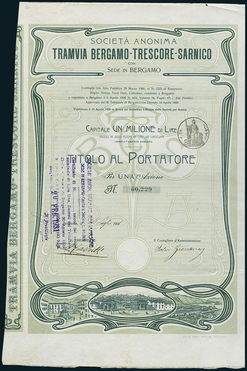 Tramvia Bergamo-Trescore-Sarnico. Una Azione L 1000. Bergamo, 15 Luglio 1901. Nr. 00229. Small tear top right. The concession for building and operating this tramway was given to the Belgian Société générale des chemins de fer Economique. The first part of the line was opened in January 1888. In 1931 the rails were removed and replaced by a bus service. Beautiful item in Art Nouveau. Panorama of the two towns. EF.