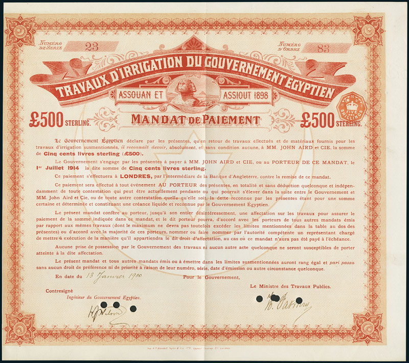 Assouan et Assiout - Travaux d’Irrigation du Gouvernement Égyptien. Mandat de Paiement £500 to John Aird & Cie on 1 July 1914 in London, 13 Janvier 1900. Serie 23, Nr. 83. The world famous old Aswan Dam and the Assiut Barrage across the Nile were constructed by the British civil engineer Sir William Willcocks (1852– 1932) and the leading engineering firm John Aird & Co. Construction started in 1892 and lasted until 1903. The Egyptian Government used these “Mandat de Paiement” for paying John Aird & Co. for its works during construction. A total of £ 4.7 Million, payable in 60 Series of 158 mandates every 6 months from 1 July 1903 until 1 January 1933 in London at the Bank of England. In 1959, Egypt built, with the support from the Soviet-Union, seven kilometres further up the Nil, a new much bigger dam. EF.