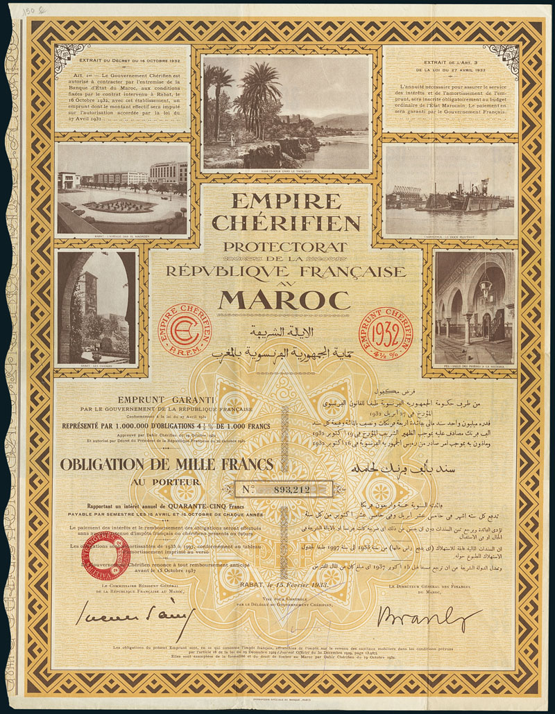 Empire Chérifien Protectorat de la République Francaise au Maroc. Obligation F 1000, Rabat, 15 Février 1933. In 1912 Marocco was divided into a french protectorate (with the capital Rabat) and a Spanish protectorate (capital Tetúan). In 1956, the country became independent again. With five pictures of Rabat (2x), Ksar-es-Souk, Casablanca and Fes. VF.