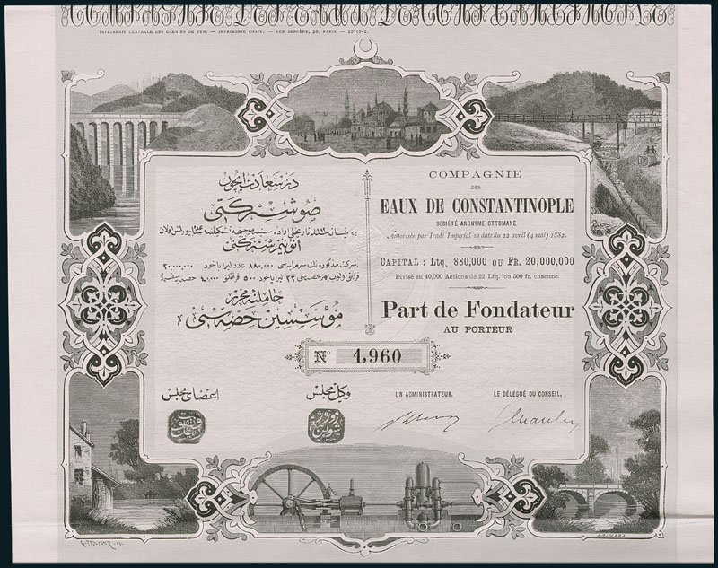 Compagnie des Eaux de Constantinople. Part de Fondateur. 22. Avril 1882. Nr. 1'960. The company was founded in 1882 and was a subsidiary of "Compagnie Générale des Eaux pour l’Étranger". It owned a concession of 40 years to supply the European part of the city of Constantinople with water. At the end of the 19th century, the company was liquidated. EF.