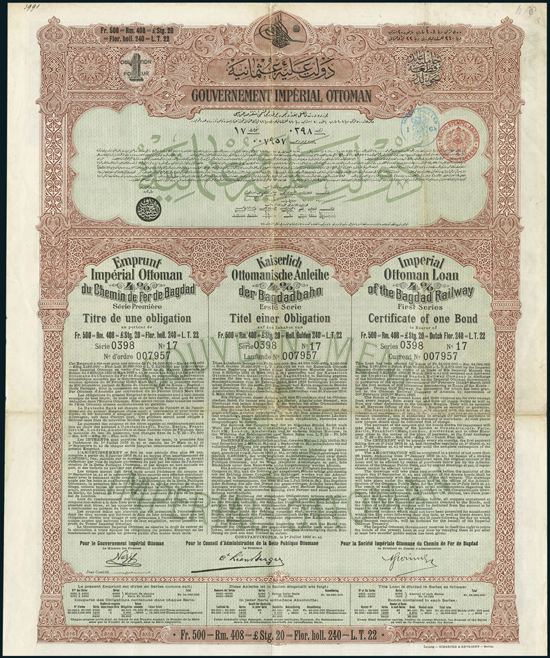 Gouvernement Impérial Ottoman / Chemin de fer de Bagdad. 4% Obligation, Série Première, F 500. 1. Juillet 1903. Nr. 007957. Traces of usage, tears on fold. VF