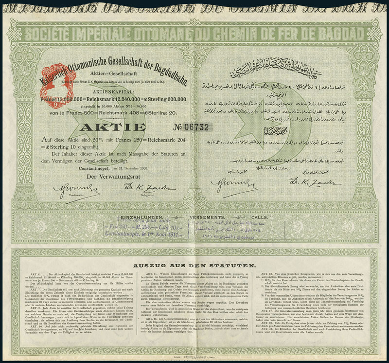 Kaiserlich Ottomanische Gesellschaft der Bagdadbahn. Aktie, F 500. Constantinopel, 31. Dezember 1903. Nr. 06732. EF.