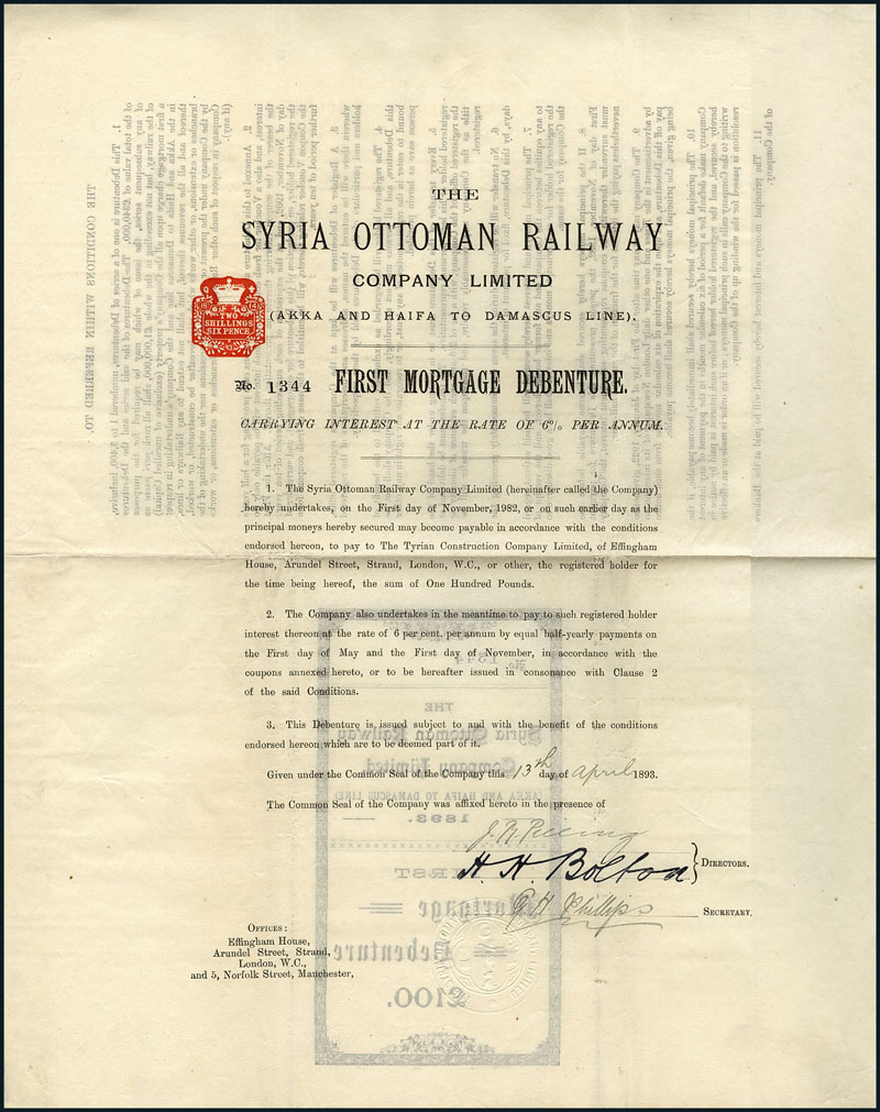 Syria Ottoman Railway Company Ltd. 6% First Mortgage Debenture, £100. 13th April 1893. Payable to the Tyrian Construction Company Ltd. With all 20 Coupons. EF.