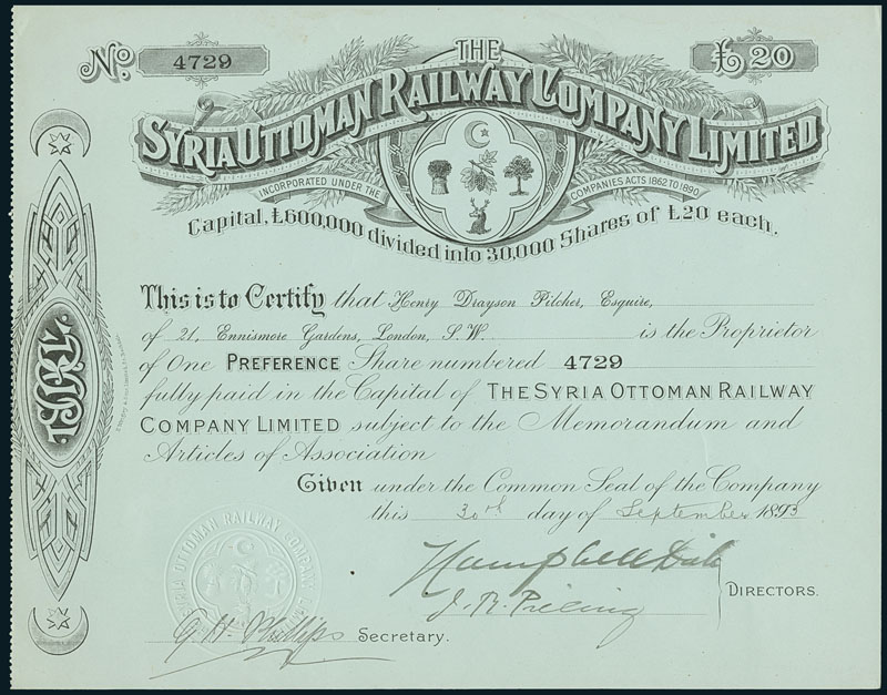 Syria Ottoman Railway Company Ltd. Preference Share, £20. 30th September 1893. Nr. 4729. The company was founded in 1891 and had a concession for building and running a railway line from Akka and Haifa to Damascus and running a shipping company on lake Tiberia. EF