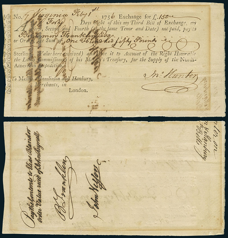 Benjamin Franklin – Bill of Exchange for Supply of the North-American Expedition, £ 150, Virginia, 1 February 1756, drawn by John Hunter on Thomlinson and Hanbury, London merchants, and made payable to Benjamin Franklin. Endorsed on the reverse side of the bill by Benjamin Franklin and John Nelson. This bill of exchange goes back to the time during the Seven Years' War (or French and Indian War) (1754–1763) when Benjamin Franklin was a commander of the Pennsylvania Militia of British America against New France. It represents the financial support of the Militia by the British Government at the time, early 1756, when Franklin was actively involved in the defence of Pennsylvania and marched with his troops toward Gnadenhutten, Ohio, a settlement that had been overrun by the French together with Shawnee and Delaware Indians. Benjamin Franklin (1706–1790) was one of the Founding Fathers of the United States and in many ways was "the First American". Franklin was a leading author, printer, political theorist, politician, postmaster, scientist, inventor, civic activist, statesman and diplomat. As a scientist, he was a major figure in the American Enlightenment and the history of physics due to his discoveries and theories regarding electricity. As an inventor, he is known for the lightning rod, bifocals, and the Franklin stove among other inventions. He was at the origin of many civic organizations, including Philadelphia's fire department and a University. Thomlinson & Hanbury were merchants in London. From 1745 onwards, they held considerable British Government contracts for victualing troops in North America and for money remittances. They were also heavily involved in the famous Ohio Company. Col John Hunter (merchant and Colonel of the Elizabeth City County militia) and John Nelson (1730-1783, Philadelphia merchant) were both Money Agents for the British forces in western Pennsylvania for Thomlinson & Hanbury (The National Archives, SmithonianMag). Text of the bill of exchange: “No. 7 Virginia Febr. 1th, Exchange for £150. A Forty Days Sight of this my Third Bill of Exchange, my First, Second and Forth (of the same Tenor and Date) not paid, pay to Benjamin Franklin, Esqr or Order, the Sum of One Hundred fifty Pounds Sterling (Value here received) and place it to Account of the Right Honorable the Lords Commissioners of his Majesty’s Treasury, for the Supply of the North-American Expedition. To Messrs Thomlinson and Hanbury, Merchants, in London.” Early item in a remarkable good condition showing the financing of the war within the British Empire and the North American Colonies and also Benjamin Franklin’s personal role during the French and Indian War. The signature of Benjamin Franklin is of highest rarity in Scripophily. This item was part of the famous Prof. Hielscher collection. EF.