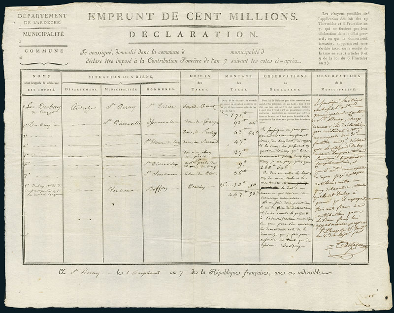 Emprunt de 100 Million. F 447,98. Département de l'Ardéche, An 7 (1798). Rare type of a enforced revolutionary loan/tax. VF.