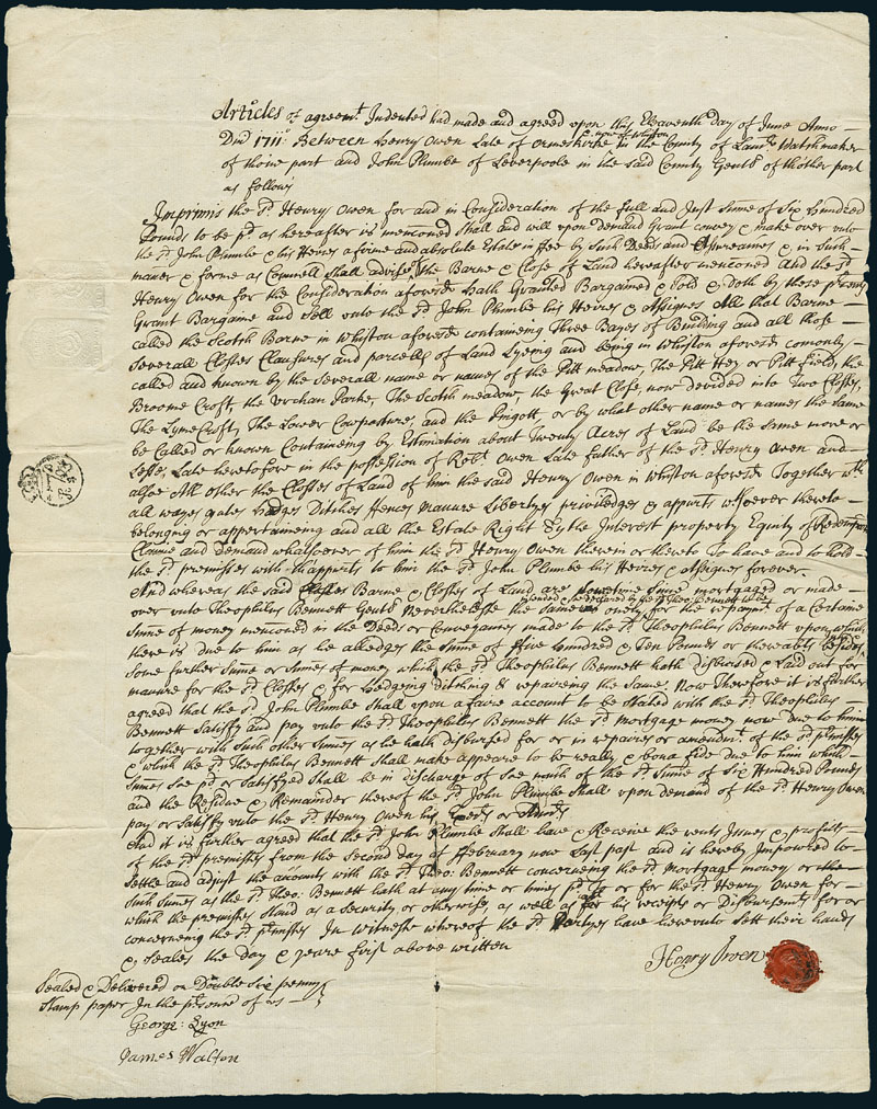 Handwritten Bond 1711. Bond £600, 11th June 1711. Handwritten contract on parchment between Henry Owen, Ormskirke, and John Plumbe(?), Liverpool. VF.
