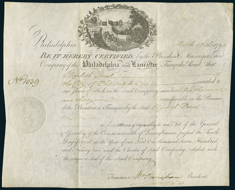 Philadelphia and Lancaster Turnpike Road. Share. Philadelphia, 16. März 1795. Nr. 1039. The Philadelphia and Lancaster Turnpike was a pioneer in American street building. The road was taken over by the state of Pennsylvania in 1911. Copperplate engraving on parchment, embossed stamp. Signature of William Bingham (1752-1804), Statesman from Philadelphia and delegate for Pennsylvania to the Continental Congress from 1786 to 1788. He served in the United States Senate from 1795 to 1801. In very good condition. EF.