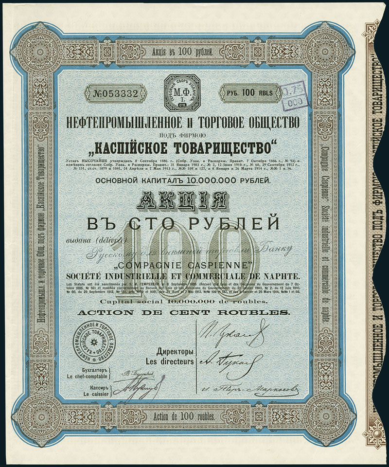 Compagnie Caspienne Société Industrielle et Commerciale de Naphte. Lot 2 items: Action 100 R, 26.03.1914 Nr. 053332 / 053334. This Naphta Company was founded 1886 in Baku.
