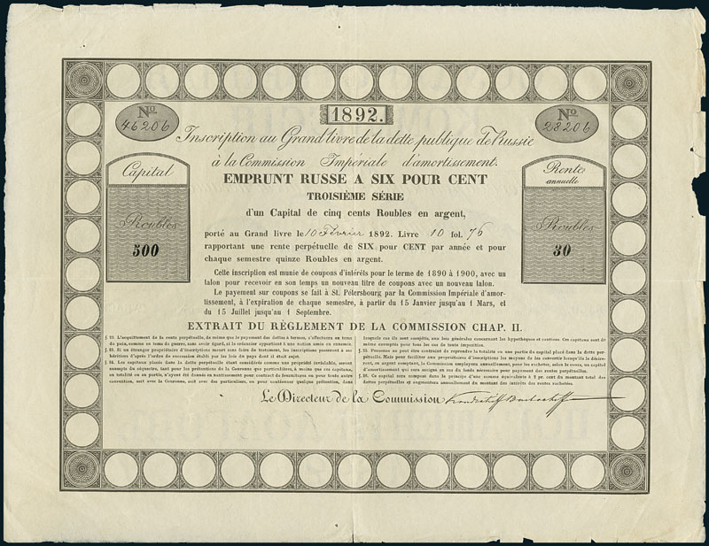 Emprunt Russe. Bond 6%, R 500, 3rd Série. 10. February 1892. Nr. 28206. VF.