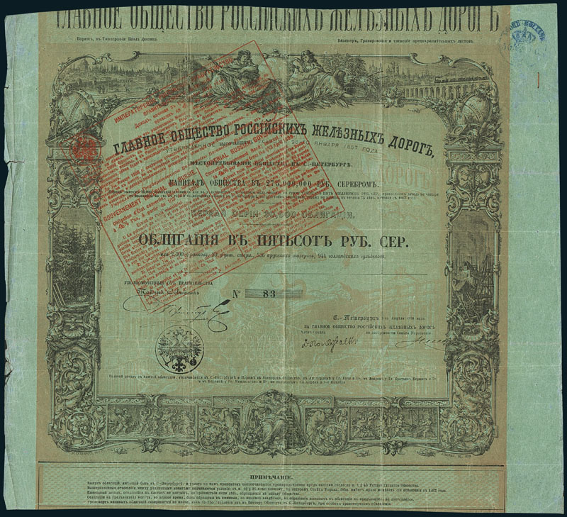 Grand Russian Railway. Obligation R 500 Silberrubel. St. Petersburg, 1. April 1859. Nr. 83. The company was founded by the French Crédit Mobilier. It build the railway St. Petersburg - Warschau, Moskau - Nishni-Nowgorod, Moskau - Feodosia and Orel-Libau, a total of more than 4,300 km. The first two lines were finished in 1863. In 1868, the Great Russian Railways also took over the Nicolai Railway Company. Red stamp and - very low - black number. VF.