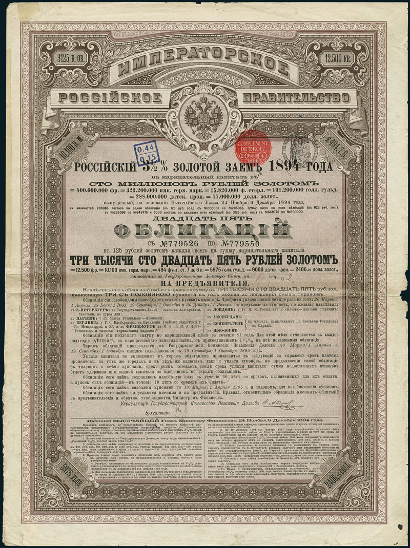Imperial Government of Russia. 25 x 125 R = 3'125 Russian 3½% Gold-Loan 6.12.1894. Nr. 779526-779550.