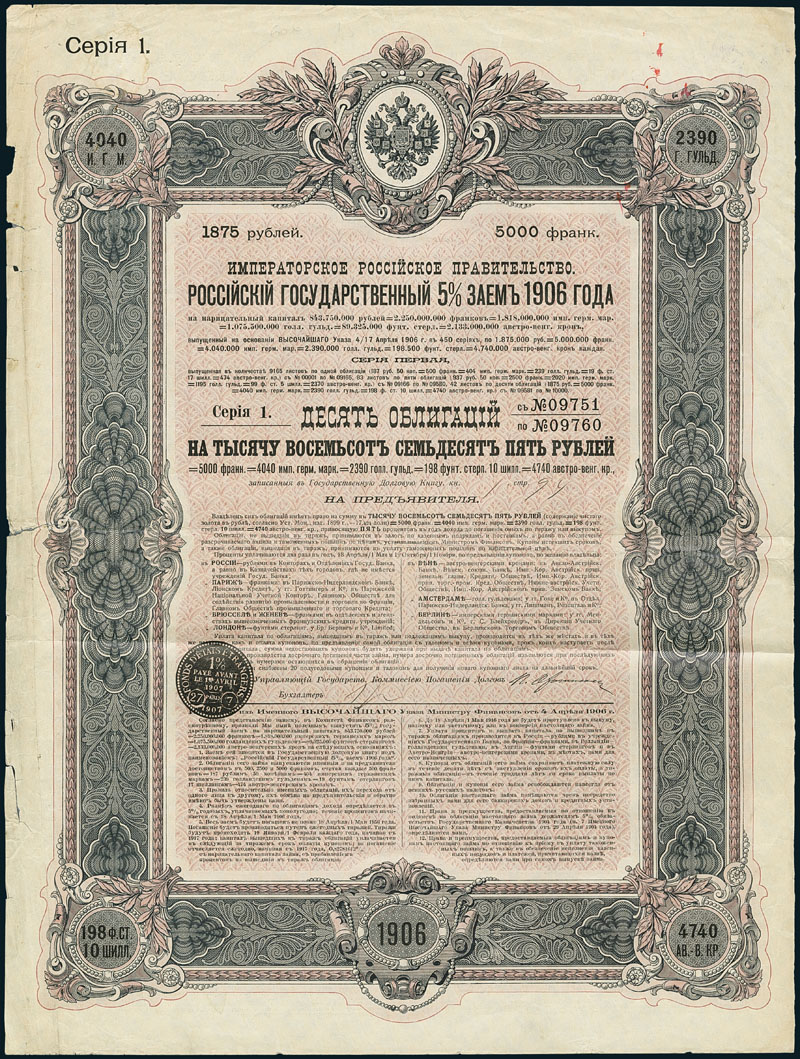 Imperial Government of Russia. 5% State-Loan 1906, 1. Serie, Certificate of 10 Bonds. 1'875 R. Nr. 09751-09760. Only 42 certificates issued of this series. Tears repaired.