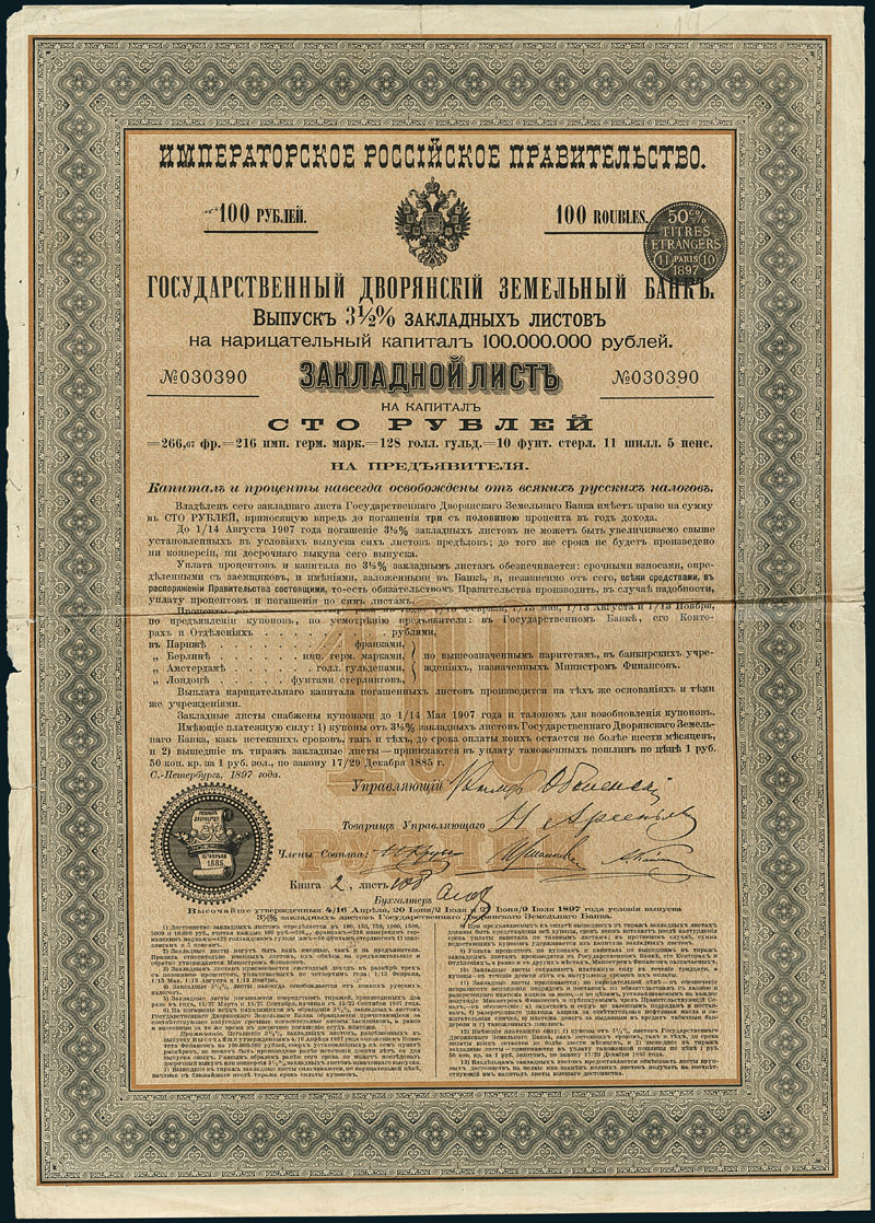 Reichs-Bodencredit-Bank für den Adel. Lot 7 different items: a) 3½ Pfandbrief 1897 100 R. b) 4% Pfandbrief 1896 300 R. c) idem 1896 300 R. d) idem 1903 100 R. e) idem 1903 300 R. f) idem 1903 500 R. g) idem 1903 1000 R.
