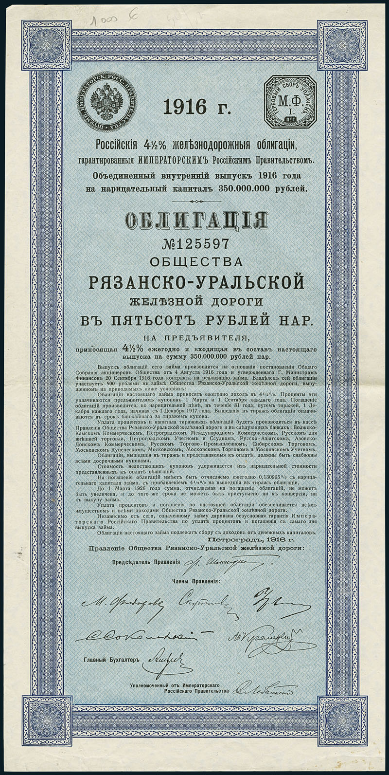 Rjäsan-Uralsk Railway. 4½ % Bond 500 R, Petrograd (St. Petersburg), 1916, Nr. 125597. Russian text only, SUE 1186b.