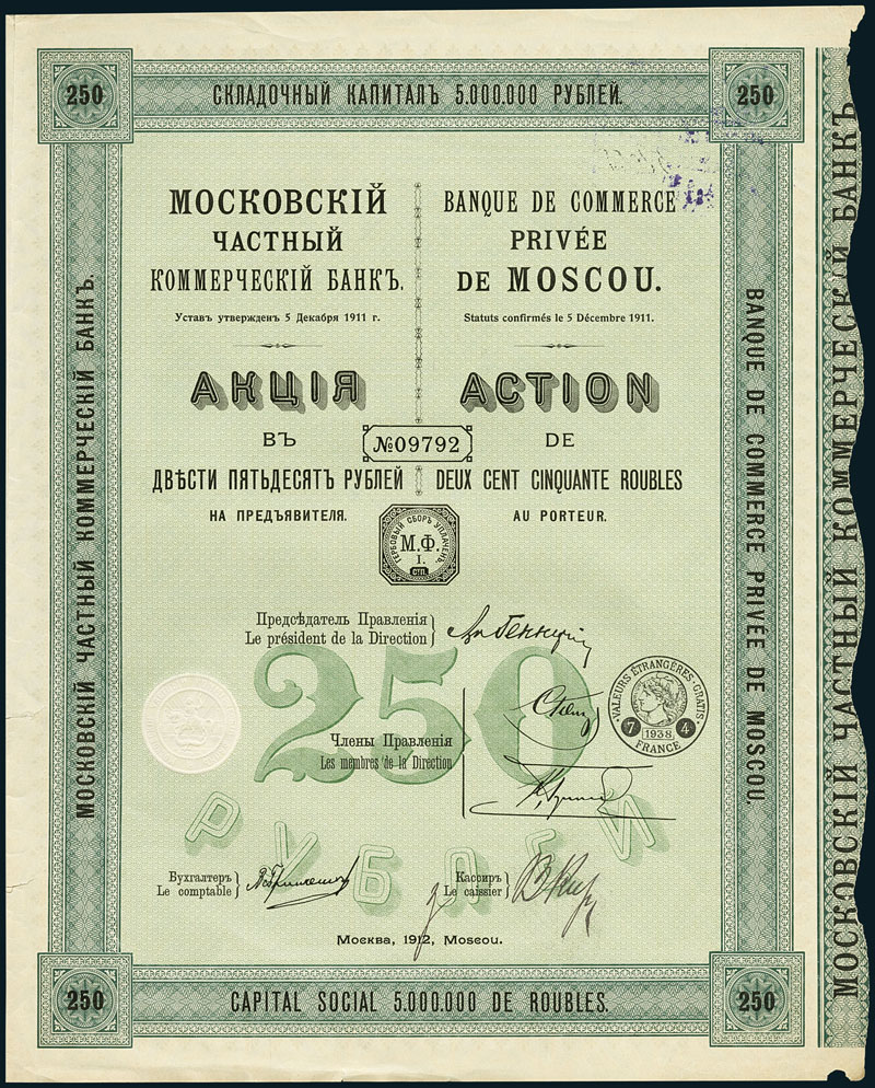 Russian Banks Collection. Lot 9 different items: a) Banque de commerce privée de Moscou, 250 R, Moscou 1912. b) Banque foncière de Poltava, Lettre de Gage, 22 Serie, 1000 R, Poltava 1910. c) Banque de Caucase, Action 6. émission, Tiflis 1916. d) Banque foncière du Don a Taganrog, Action 250 R, 5. émission. e) Banque foncière pour faciliter aux paysans l'acquisition de terres, 5% Certificat de l'état 1000 R 1911. f) Banque foncière pour faciliter aux paysans l'acquisition de terres, 4½% Certificat de l'état 1000 R 1914. g) Banque de Commerce de l'Azoff-Don, Action 250 R, 1908. h) Banque de l'Union, Action 200 R, Moskau 1910. i) Banque foncière de Kiev, Pfandbrief 100 R, 17. Emission, Kiev 1902.