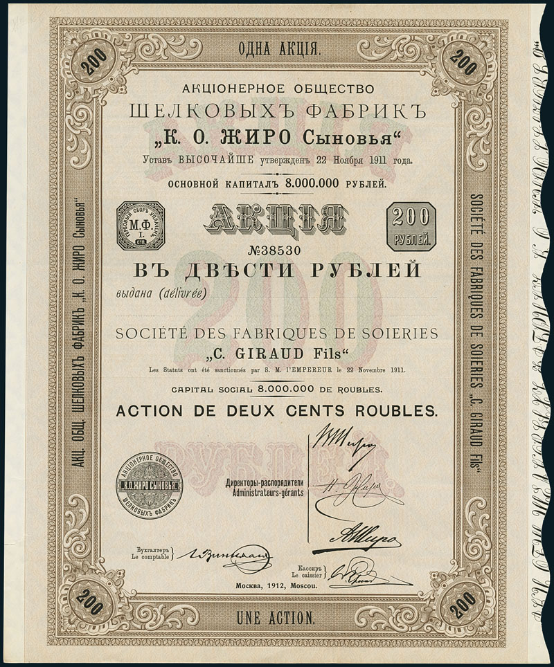 Société des Fabriques de Soierie "C. Giraud Fils". Action de 200 R, Moscou, 1912 Nr. 38530. EF.