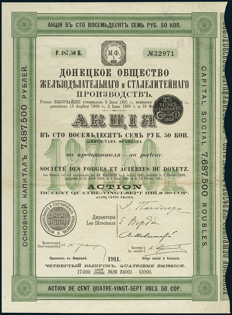Société des Forges et Aciéries du Donetz. Lot 3 items: Varsovie, 1911 a) Action 187,5 R green b) Obligation 187,5 R 2me émission green c) Obligation 187,5 R 3me émission blue. Nr. 32971 / 13245 / 31642. The Company was founded in 1892. It moved from Druszkowka/Jekaterinoslaw to Warsaw in 1900.