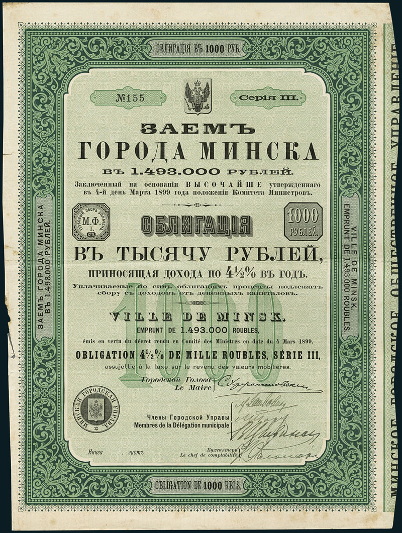 Ville de Minsk. 4½% Obligation 1'000 R, Serie III, 14.06.1899 Nr. 155. Tears repaired. VF.