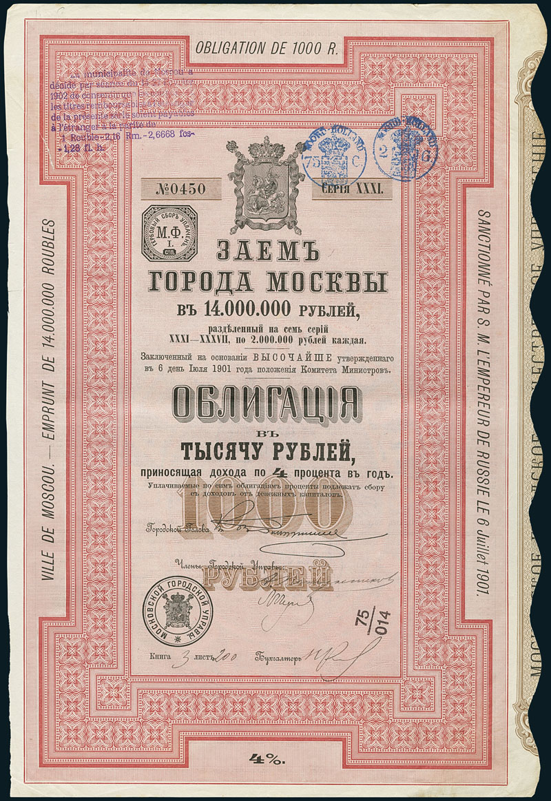 Ville de Moscou. 4% Obligation de 1'000 R, Serie XXXI, 1901 SUT 2075c, R10. Nr. 0127. VF.